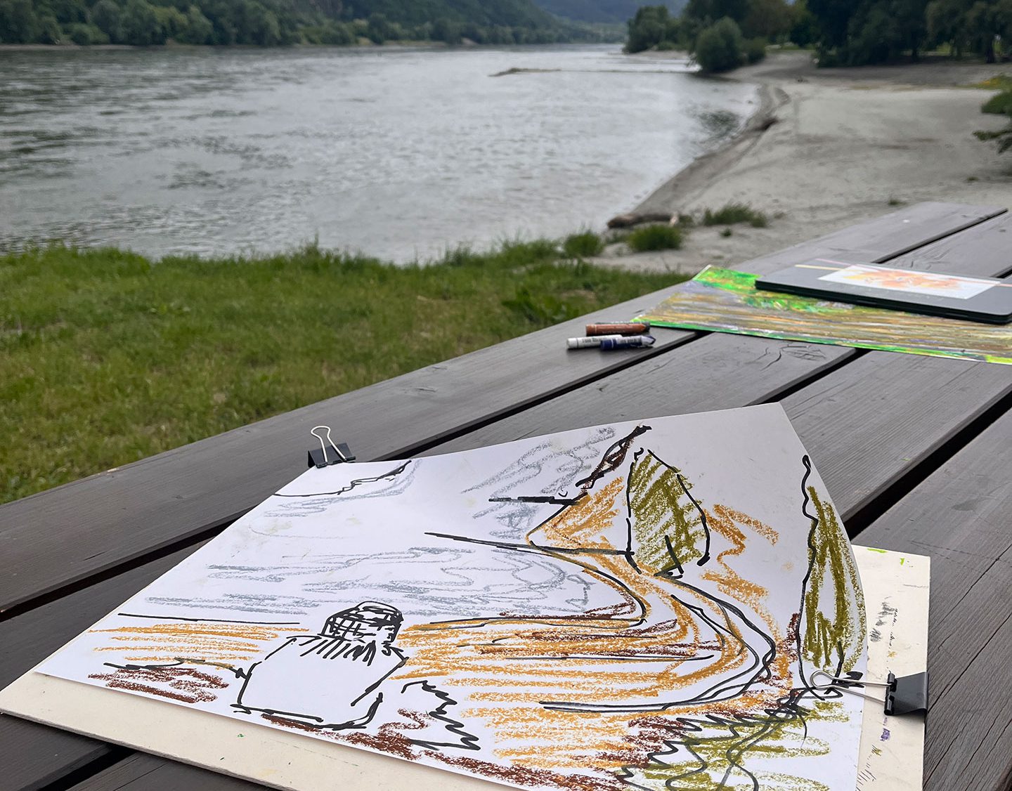 The drawing excursion with students from BOKU University and the University of Arts Linz is part of the research process and took place for the third time. Following this year’s focus on biking and hiking trails, we cycled from Krems to Spitz and recorded the journey with helmet cameras. Additional wire-mounted cameras recorded the different surfaces and unevenness. We stopped at two scenically different, but at the same time characteristic places in the Wachau to draw them: the wine terraces and the banks of the Danube. The adjectives seismographic, cartographic and depictive have guided us in our drawing.