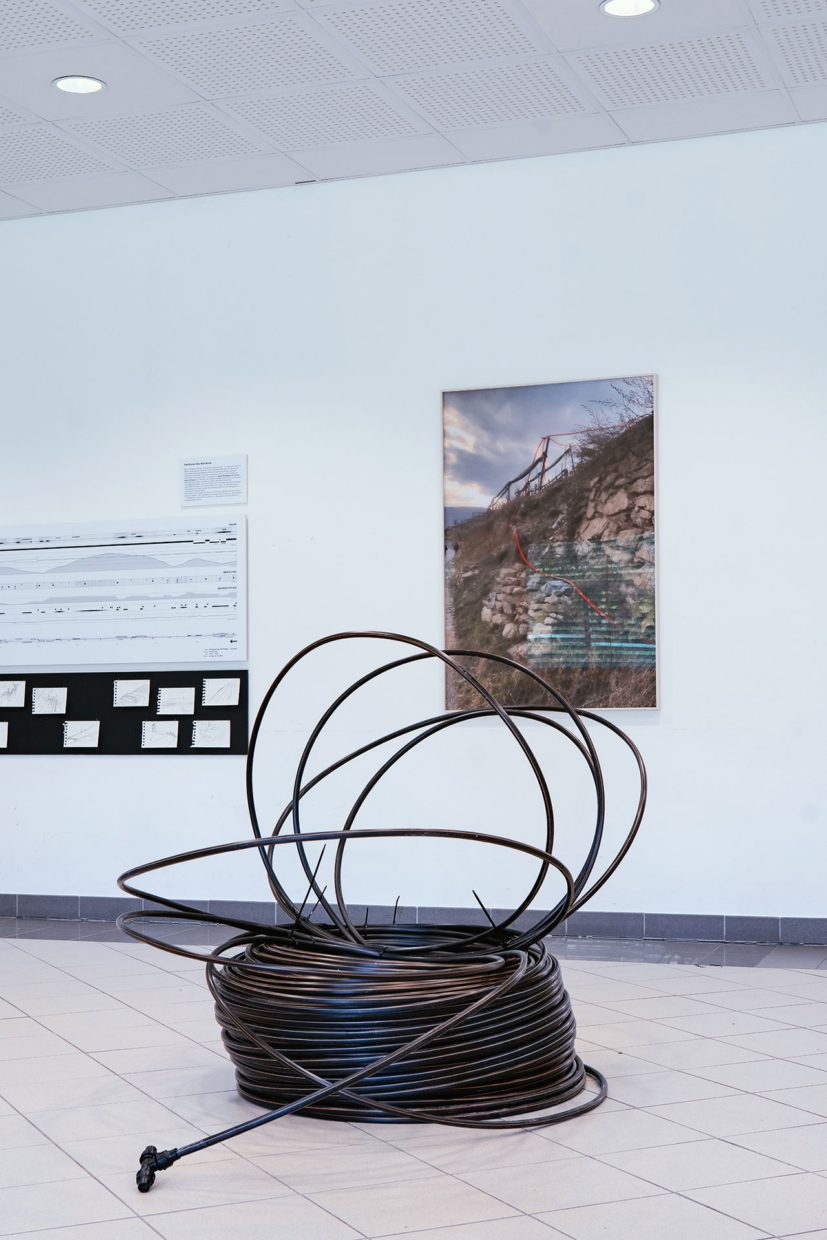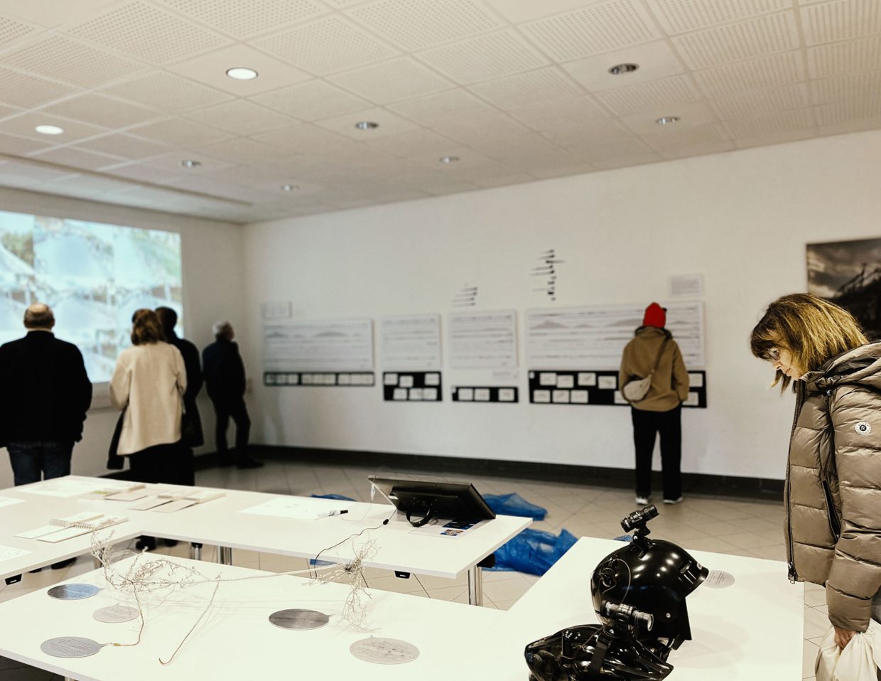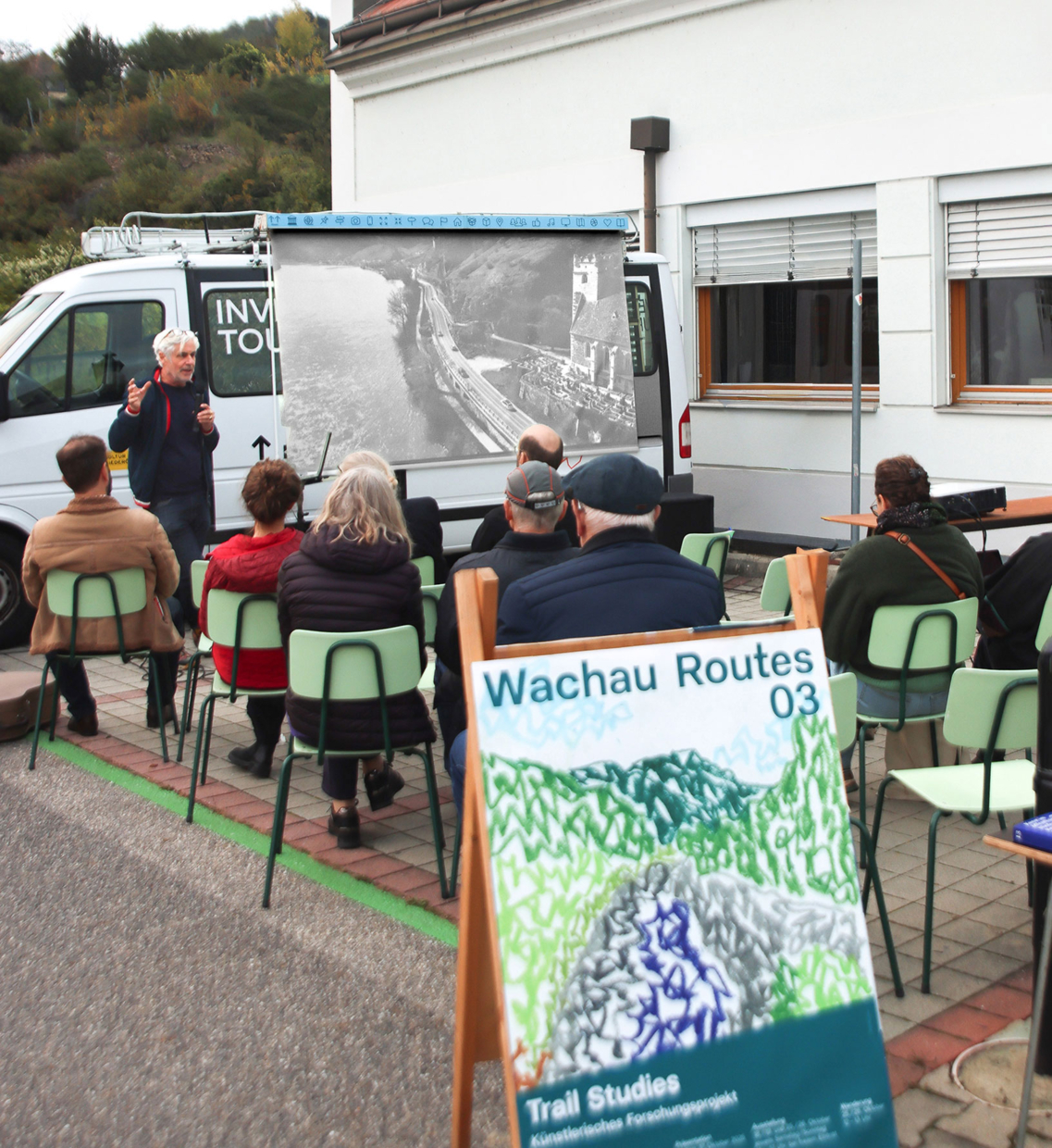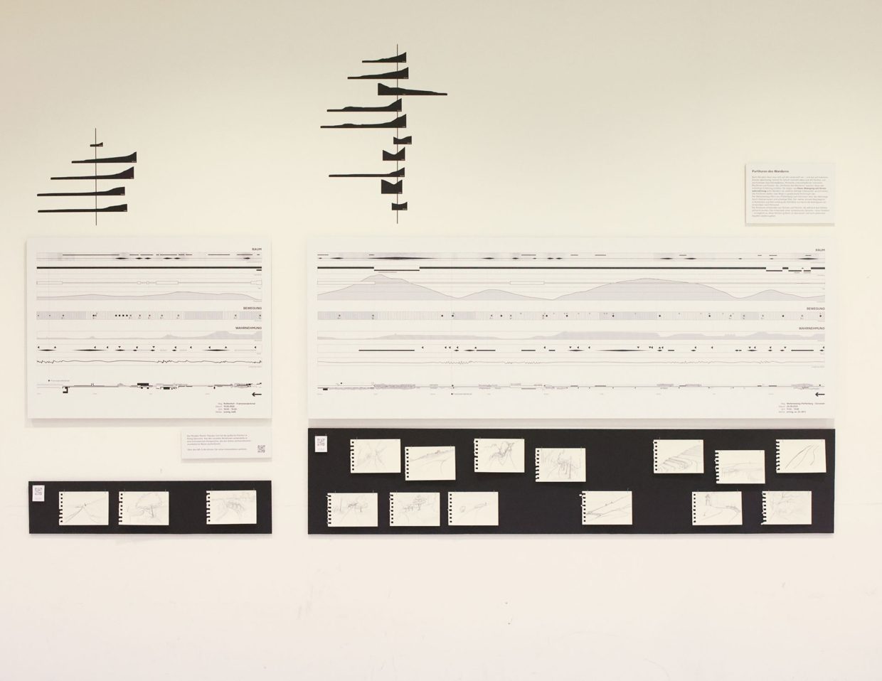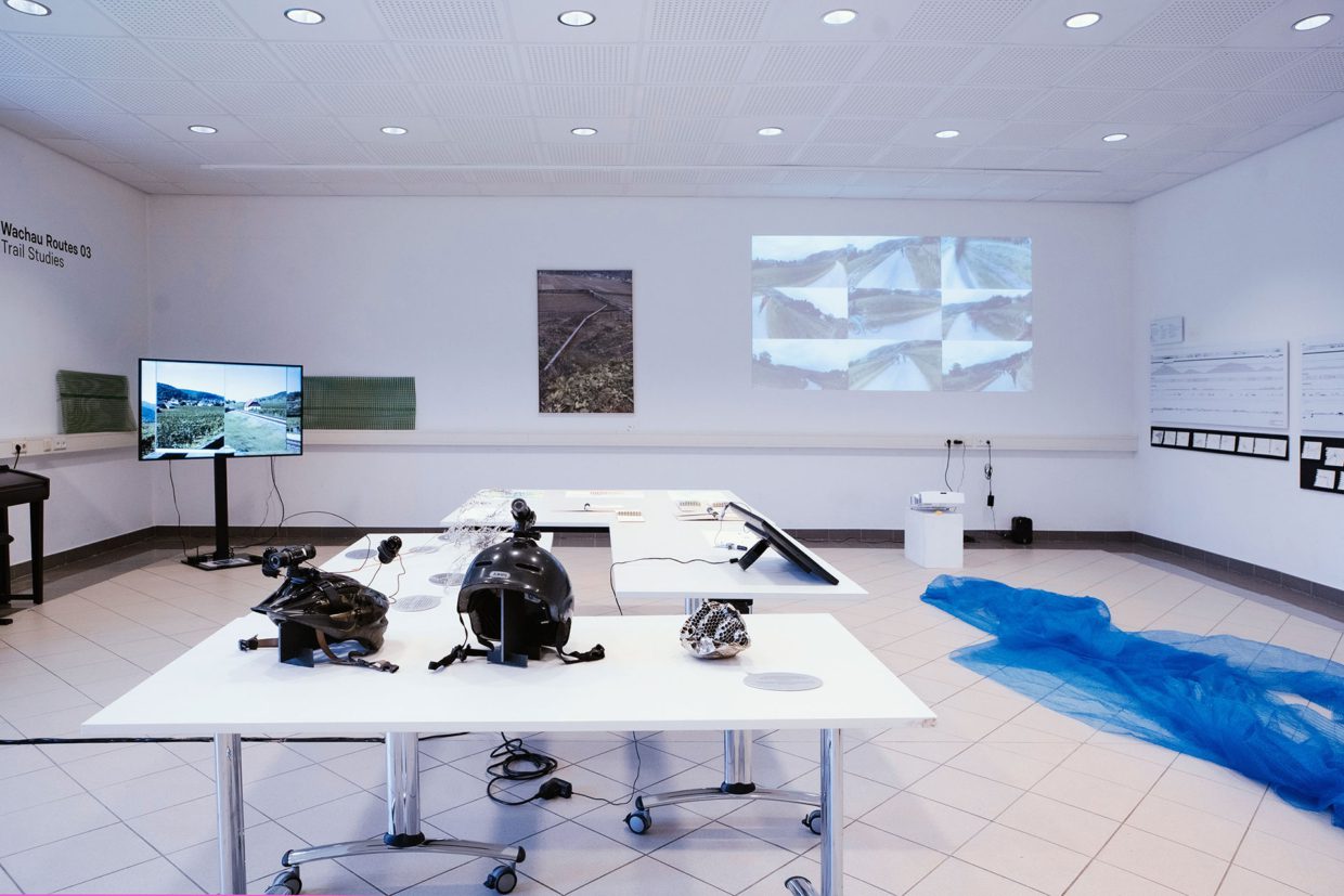 Gezeigt wurden künstlerische und landschaftsarchitektonische Perspektiven auf Wege durch die Wachauer Landschaft. Künstlerische Filme erweiterten über experimentelle Anordnungen von Spiegeln, Kamera und die Bewegungsrichtung den Blick auf die Landschaft. Bewässerungssysteme und Schutznetze aus den Weingärten wurden in der Ausstellung skulptural inszeniert und thematisierten die landwirtschaftliche Nutzung der Wege. Eine Wanderkarte präsentierte sequenziell landschaftliche und historische Details entlang eines Weges, die nun eigenständig erkundet werden können. Die Vielschichtigkeit von Wahrnehmungen während des Gehens wurde mittels grafischer Notationen in Partituren übersetzt und dargestellt. Der Musiker Martin Gut interpretierte diese Partituren von Wegen rund um Dürnstein instrumental. Seine musikalische Performance verband die Ausstellung mit der regulären Nutzung des Multisaals für den Musikunterricht. Zeichnungen von Studierenden und Aufnahmen mit Helmkameras, die während einer Radexkursion entstanden, ergänzten die vielfältigen Wegstudien in der Ausstellung.